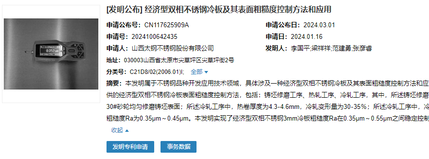 2024年3月1日,山西太鋼不銹鋼股份有限公司成功申請一項名為“一種用于超低碳不銹鋼管的防止熱處理增碳的方法”專利,申請公布號CN117625909A,申請日期為2024年1月16日。